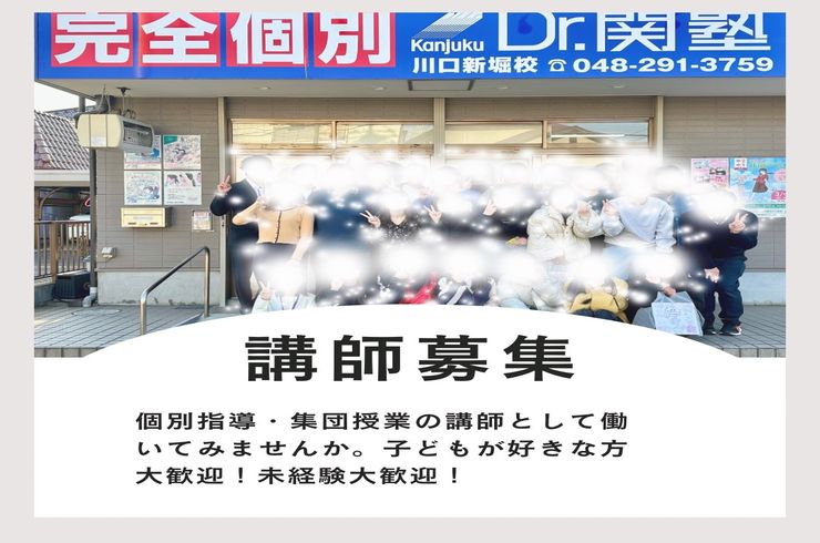草加のDr.関塾川口新堀校は、生徒一人ひとりの能力に合わせ、希望する学校に合格するための個別指導教室です。講師一人に生徒が三人の少人数制指導体制をベーシックコースとし、講師一人に生徒一人のクオリティーコースも設けています。完全個別指導として講師は「生徒がわかるまで、できるまで」を合い言葉に、生徒へ寄り添い丁寧な指導で対応いただける講師を募集しています。